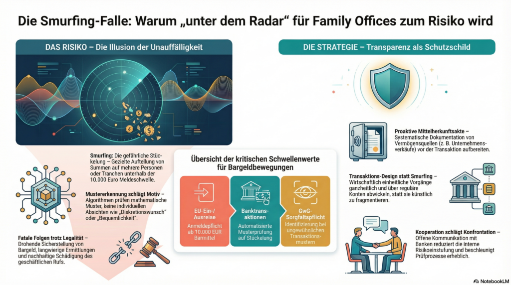 Für vermögende Privatpersonen, Unternehmerfamilien und Family Offices ist Smurfing kein Randthema. Unter den Bedingungen moderner Finanz-Compliance kann bereits der bloße Anschein der Umgehung von Meldeschwellen gravierende Folgen haben – bis hin zu eingefrorenen Konten, langwierigen Ermittlungen und nachhaltigen Reputationsschäden.